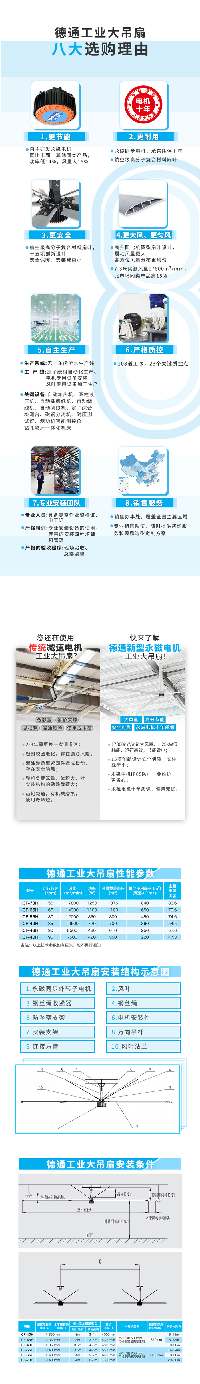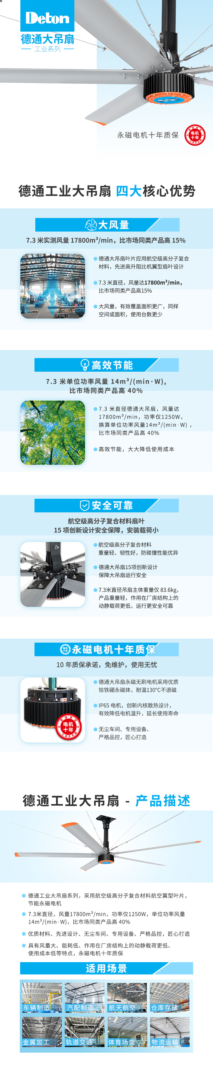 【高效节能】:7.3米单位功率风量14m3/(min·W),比市场同类产品高40%